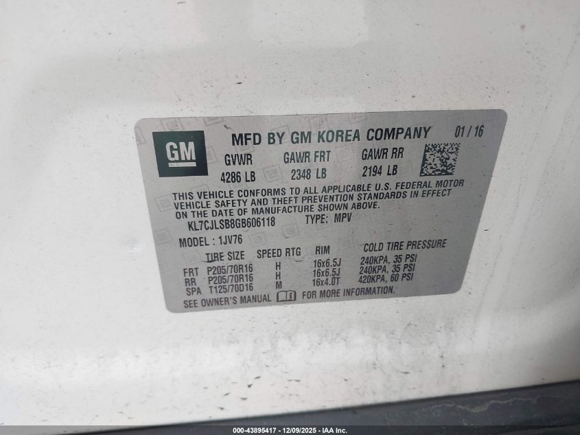 2016 CHEVROLET TRAX - KL7CJLSB8GB606118, колір - Білий, 1.4, Бензин, Передній привід із США
