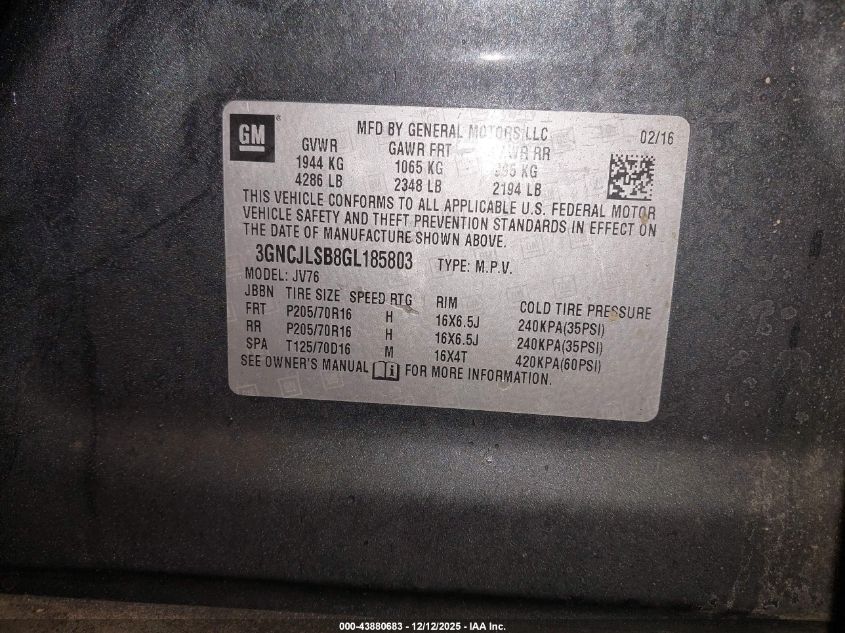 2016 CHEVROLET TRAX - 3GNCJLSB8GL185803, колір - Сірий, 1.4, Бензин, Передній привід із США