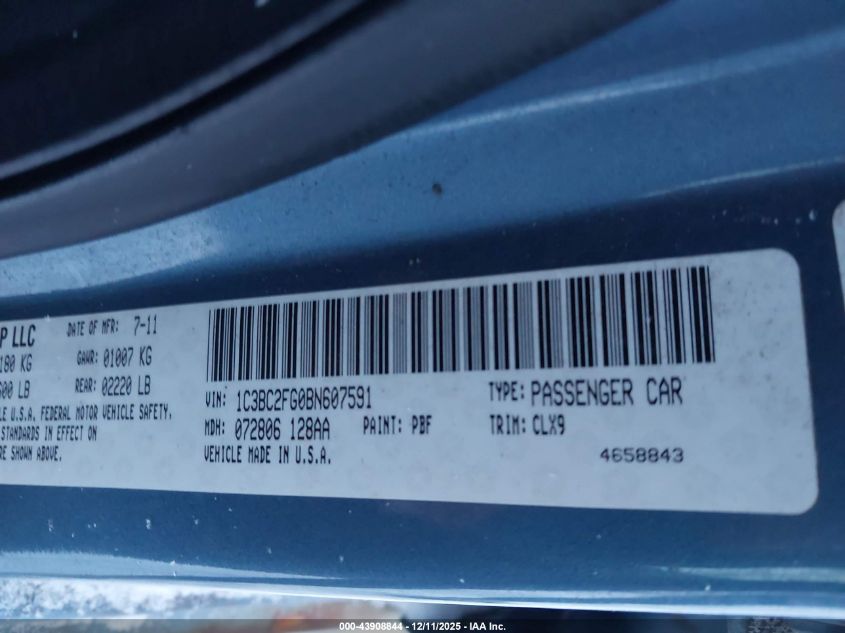 Колір СинійЦиліндри 6Привід Передній привідVIN 1C3BC2FG0BN607591Стан Заводиться та їде (перевірено)Ушкодження Звичайний зносДата аукціона 2025-12-18