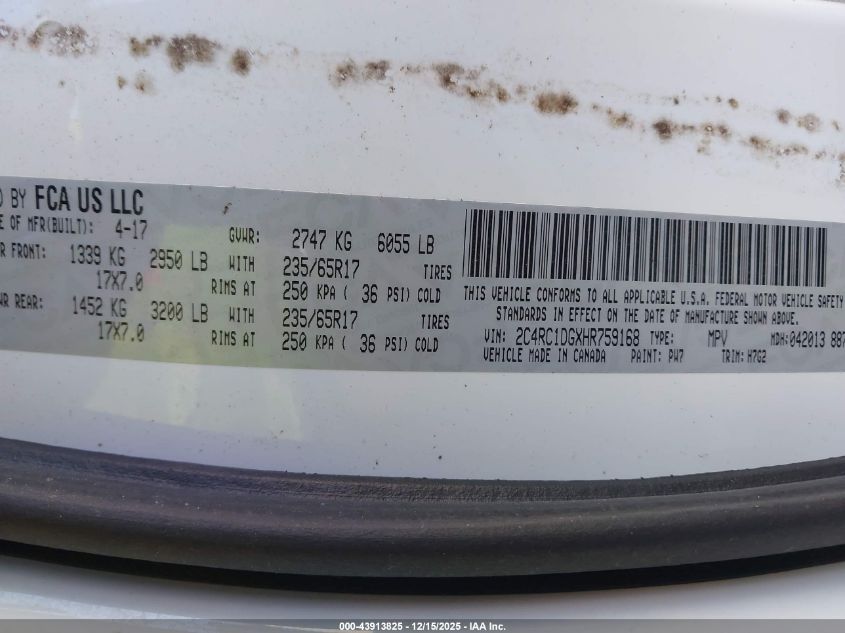 2017 CHRYSLER PACIFICA - 2C4RC1DGXHR759168, колір - Білий, 3.6, Бензин, Передній привід із США
