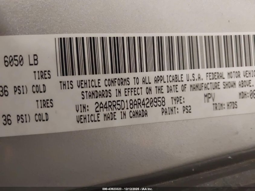 Колір СрібнийЦиліндри 6Привід Передній привідVIN 2A4RR5D18AR420958Стан СтаціонарноУшкодження Передня ліва