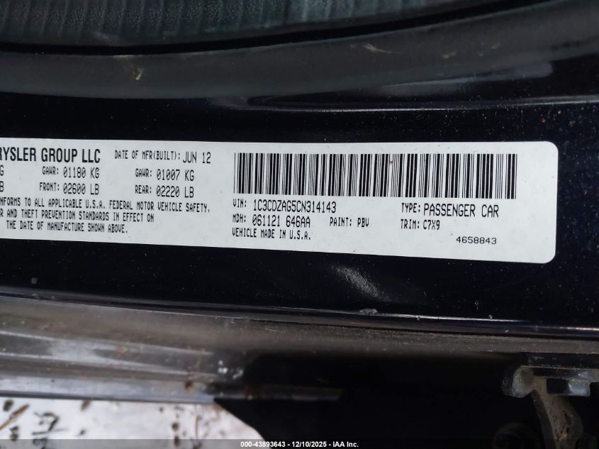 Колір ЧорнийЦиліндри 6Привід Передній привідVIN 1C3CDZAG5CN314143Стан Заводиться та їде (перевірено)Ушкодження Передня або задняДата аукціона 2025-12-18