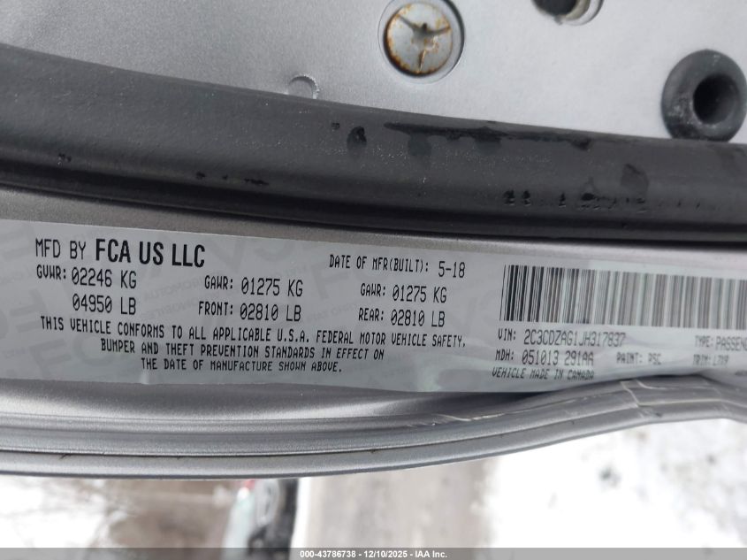 Колір СрібнийЦиліндри 6Привід Задній привідVIN 2C3CDZAG1JH317837Стан Заводиться та їде (перевірено)Ушкодження Ліва сторона