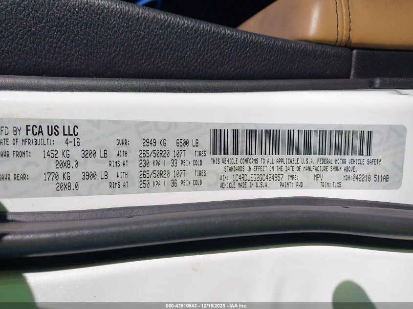 Колір БілийЦиліндри 6Привід Повний привідVIN 1C4RDJEG2GC424957Стан СтаціонарноУшкодження Ліва сторона