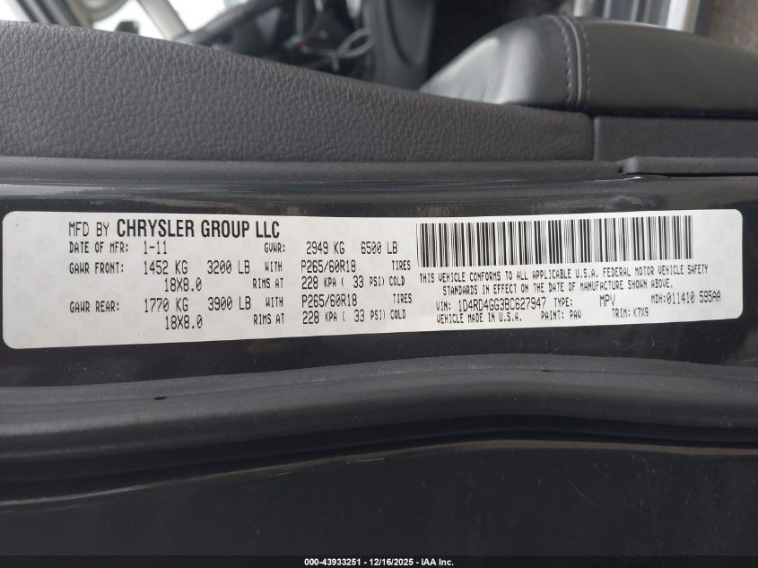 2011 DODGE DURANGO - 1D4RD4GG3BC627947, колір - Сірий, 3.6, Бензин, із США