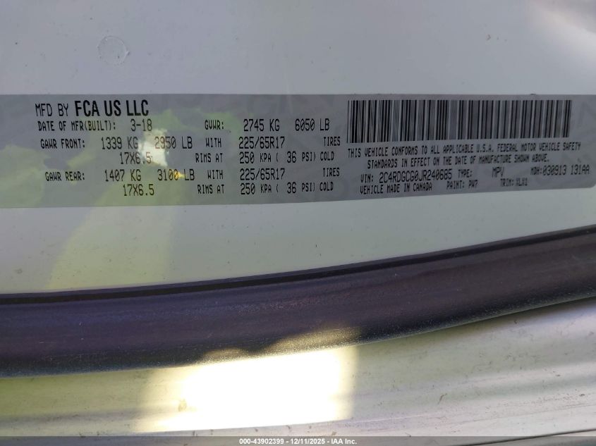 2018 DODGE GRAND CARAVAN - 2C4RDGCG0JR240685, колір - Білий, 3.6, Бензин, Передній привід із США