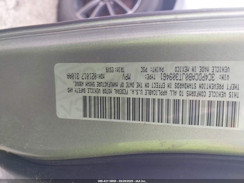 Колір СірийЦиліндри 4Привід Передній привідVIN 3C4PDCAB0JT309461Стан СтаціонарноУшкодження Пожежа двигуна