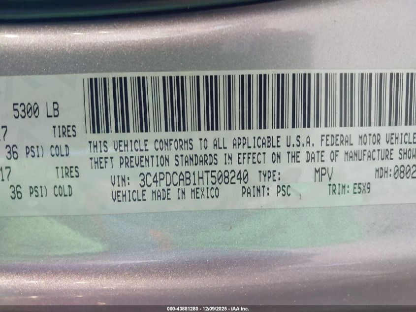 Колір СрібнийЦиліндри 4Привід Передній привідVIN 3C4PDCAB1HT508240Стан СтаціонарноУшкодження По всьому авто