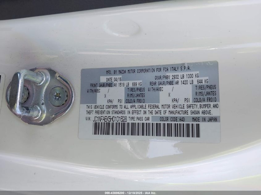 2017 FIAT 124 SPIDER - JC1NFAEK5H0101628, колір - Білий, 1.4, Бензин, Задній привід із США
