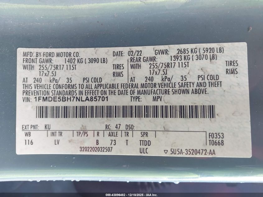 Колір СинійЦиліндри 4Привід Повний привідVIN 1FMDE5BH7NLA85701Стан СтаціонарноУшкодження Передня або задня