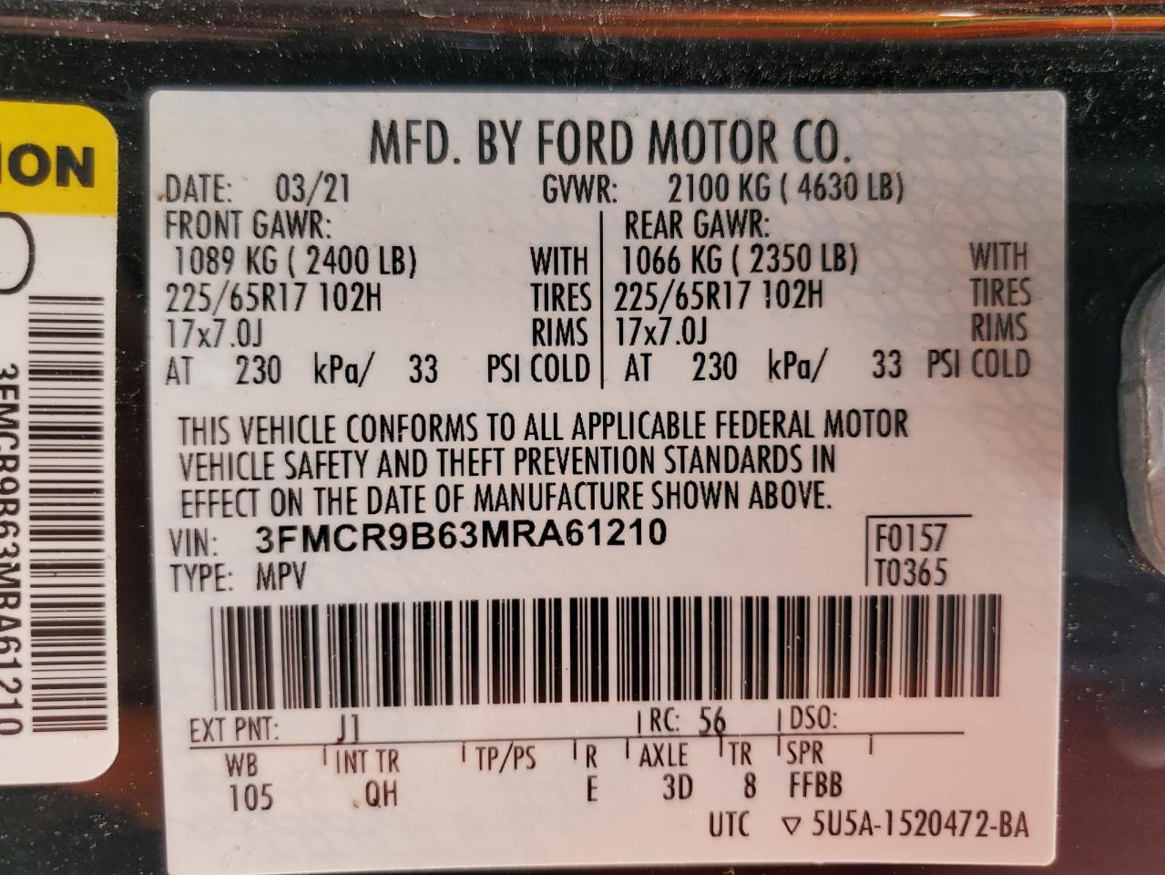 2021 FORD BRONCO SPORT - 3FMCR9B63MRA61210, колір - Коричневий, 1.5, Бензин, 4x4 з переднім приводом із США