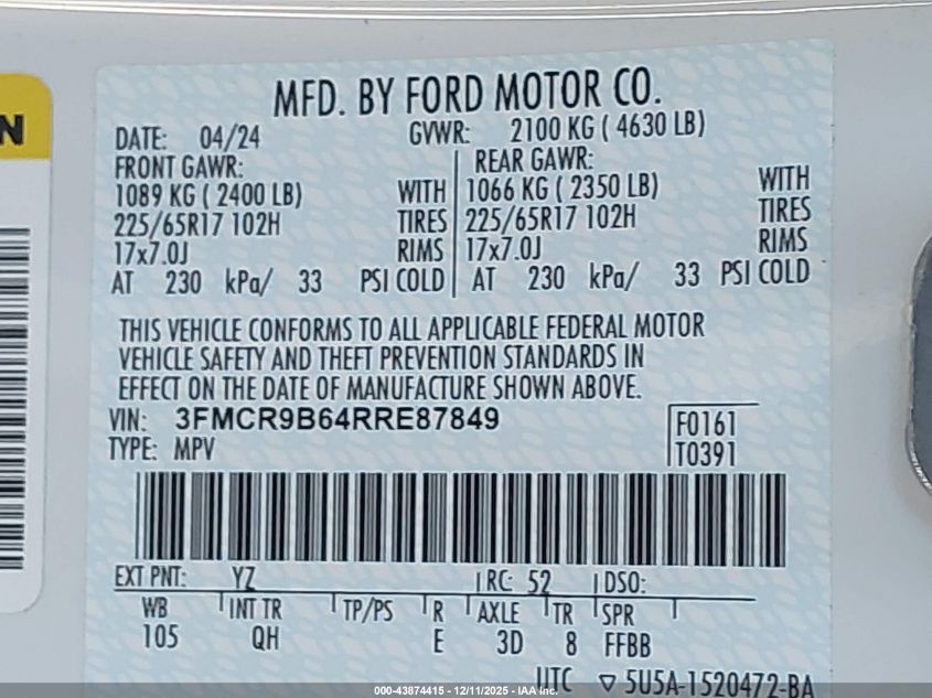 2024 FORD BRONCO SPORT - 3FMCR9B64RRE87849, колір - Білий, 1.5, Бензин, Повний привід із США