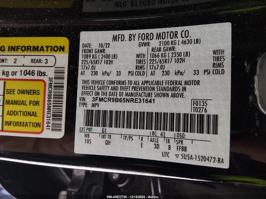 2022 FORD BRONCO SPORT - 3FMCR9B65NRE31641, колір - , 1.5, Бензин, Повний привід із США