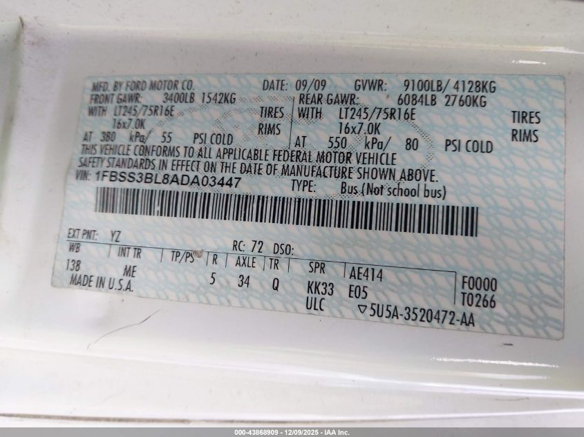 2010 FORD E-350 - 1FBSS3BL8ADA03447, колір - Білий, 5.4, Бензин, Задній привід із США