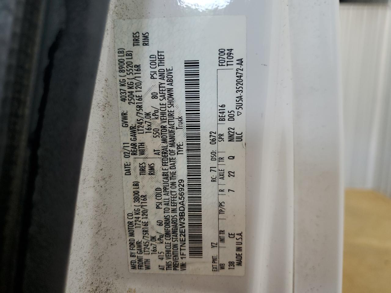 Колір БілийЦиліндри 8Привід Задній привідVIN 1FTNE2EW3BDA56929Стан Заводиться та їде (перевірено)Ушкодження НезначніДата аукціона 2025-10-09