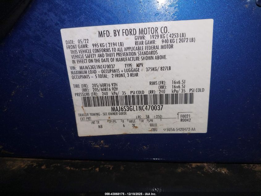 2022 FORD ECOSPORT - MAJ6S3GL1NC470037, колір - Синій, 2.0, Бензин, Повний привід із США
