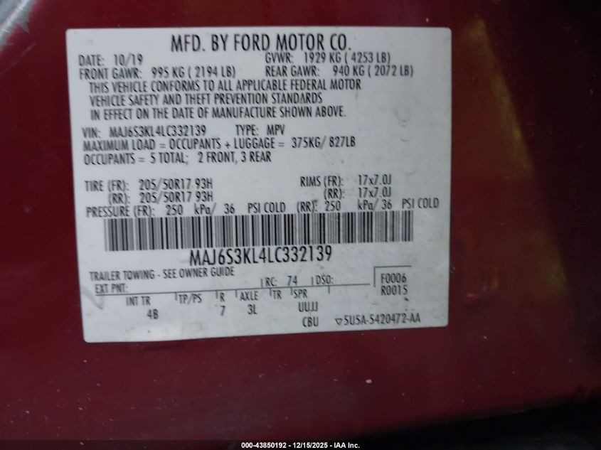 2020 FORD ECOSPORT - MAJ6S3KL4LC332139, колір - Червоний, 2.0, Бензин, Повний привід із США