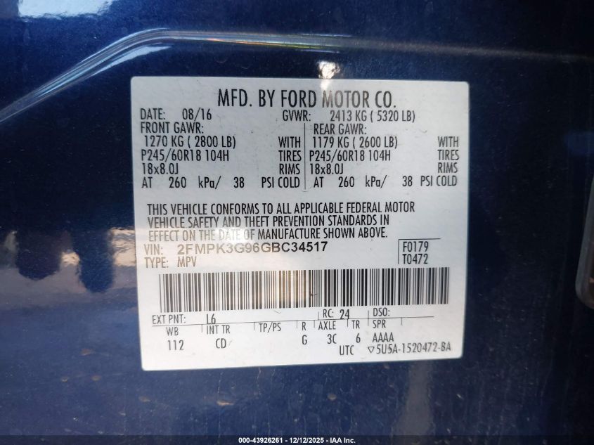 2016 FORD EDGE - 2FMPK3G96GBC34517, колір - Синій, 2.0, Бензин, Передній привід із США