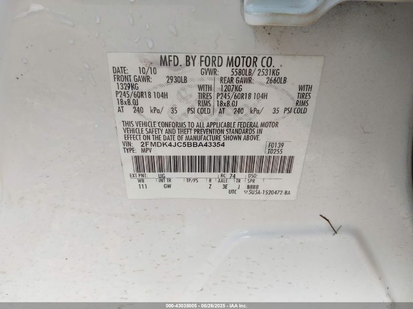 2011 FORD EDGE - 2FMDK4JC5BBA43354, колір - Білий, 3.5, Бензин, Повний привід із США