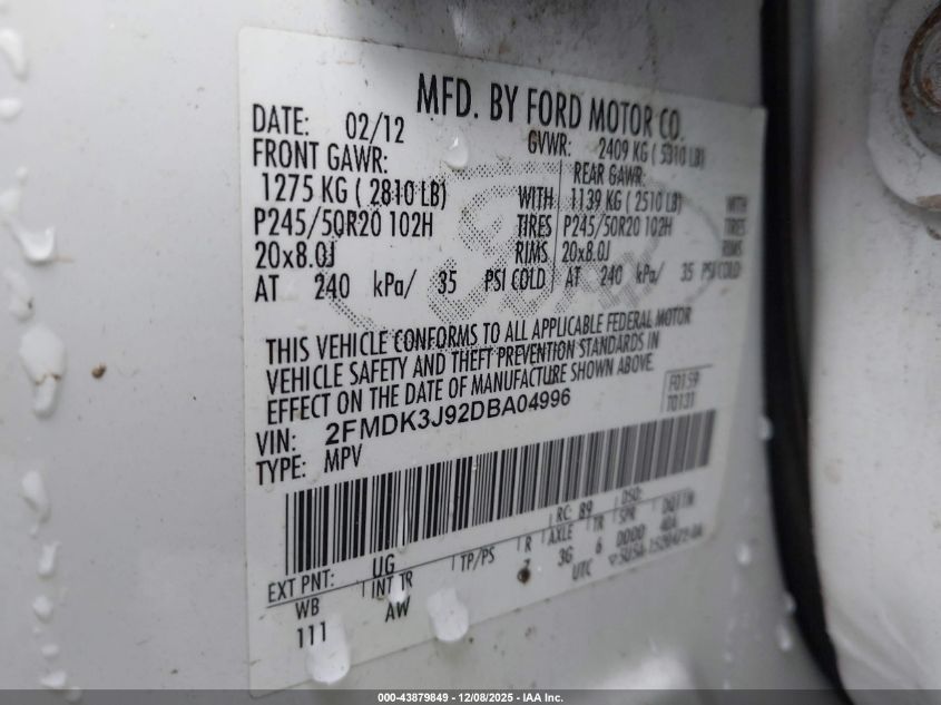 2013 FORD EDGE - 2FMDK3J92DBA04996, колір - Білий, 2.0, Бензин, Передній привід із США