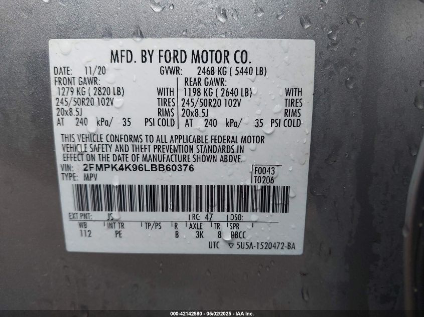 2020 FORD EDGE - 2FMPK4K96LBB60376, колір - Сірий, 2.0, Бензин, Повний привід із США