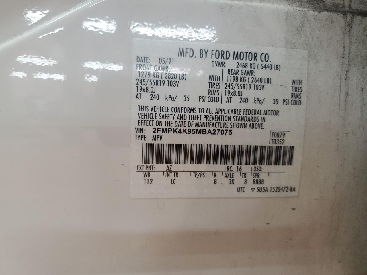 2021 FORD EDGE - 2FMPK4K95MBA27075, колір - Білий, 2.0, Бензин, Повний привід із США