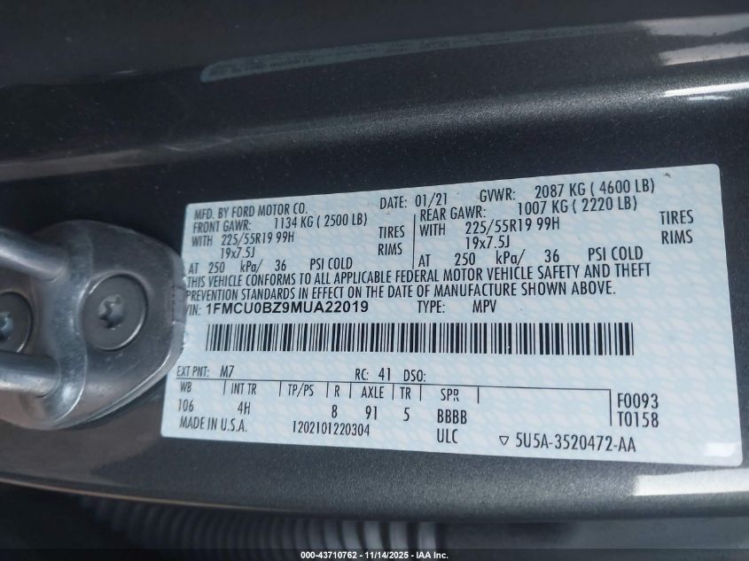 Колір СірийЦиліндри 4Привід Передній привідVIN 1FMCU0BZ9MUA22019Стан Заводиться та їде (перевірено)Ушкодження Ліва сторона