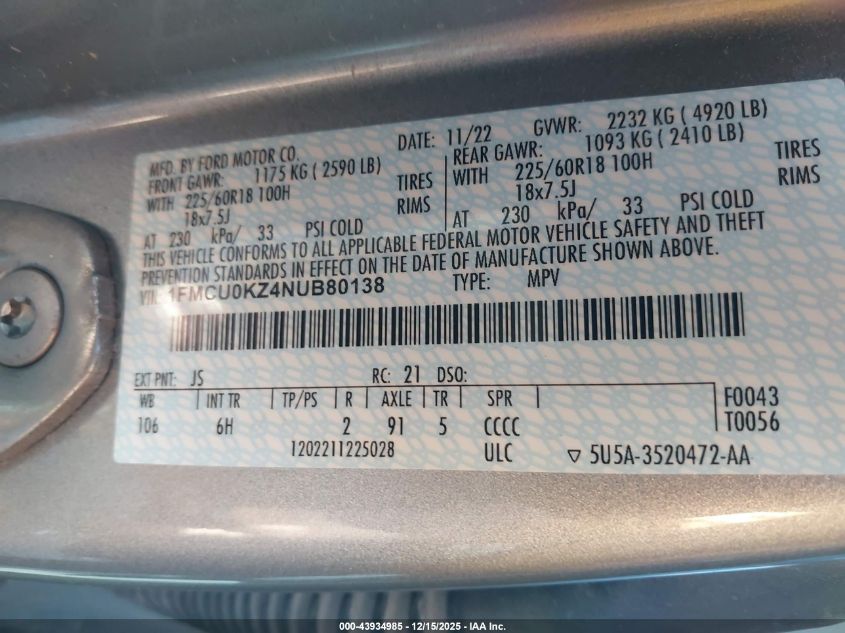 Колір Циліндри 4Привід Передній привідVIN 1FMCU0KZ4NUB80138Стан НевідомоУшкодження Невідомо