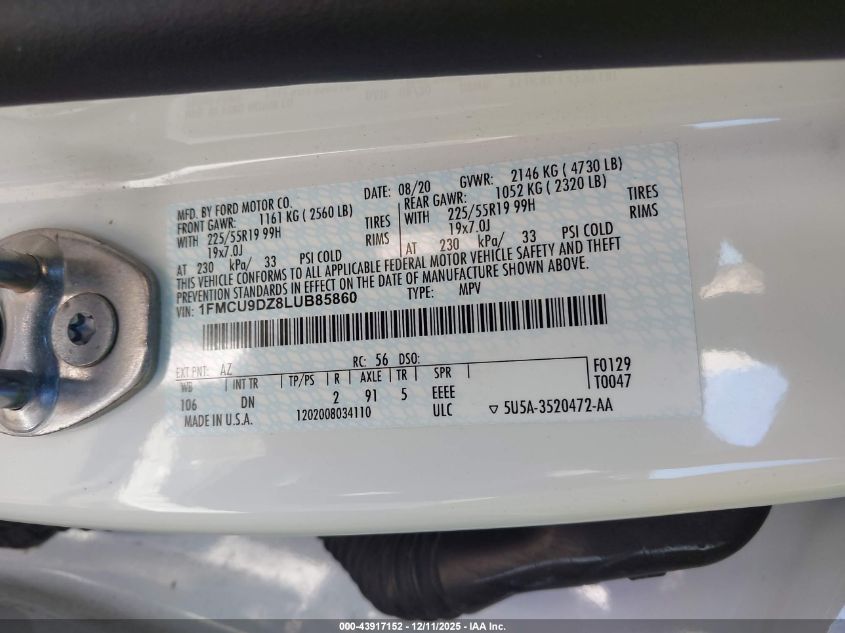 Колір БілийЦиліндри 4Привід Повний привідVIN 1FMCU9DZ8LUB85860Стан СтаціонарноУшкодження Задня