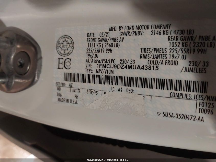 2021 FORD ESCAPE HYBRID - 1FMCU9DZ4MUA43815, колір - , 2.5, Гібрид, Повний привід із США