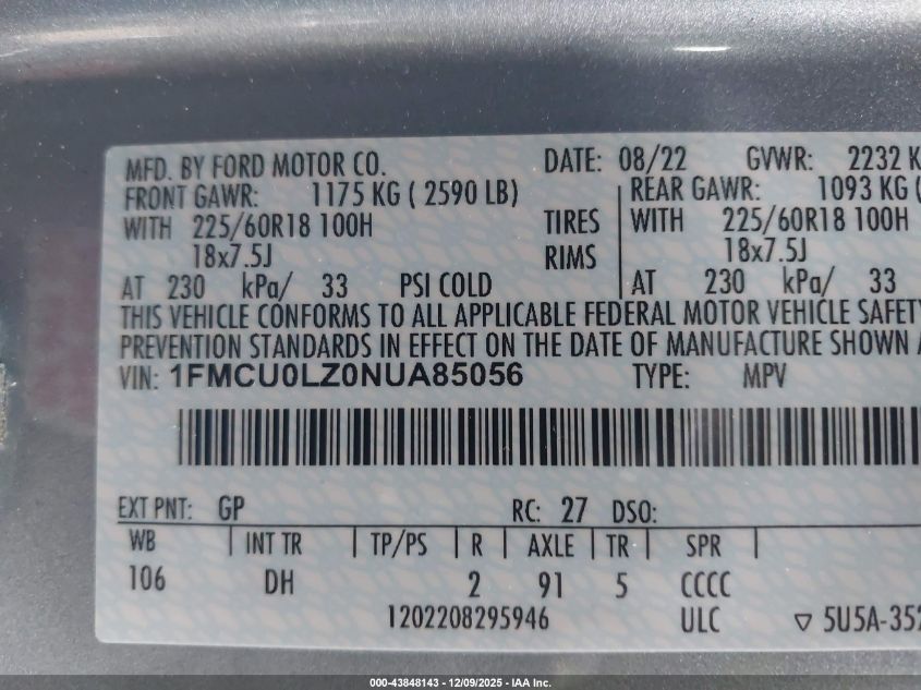 Колір СинійЦиліндри 4Привід Передній привідVIN 1FMCU0LZ0NUA85056Стан Заводиться та їде (перевірено)Ушкодження Передня або задня