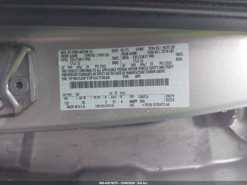 Колір СрібнийЦиліндри 4Привід Передній привідVIN 1FMCU0F73FUC73629Стан Заводиться та їде (перевірено)Ушкодження Звичайний зносДата аукціона 2025-12-17