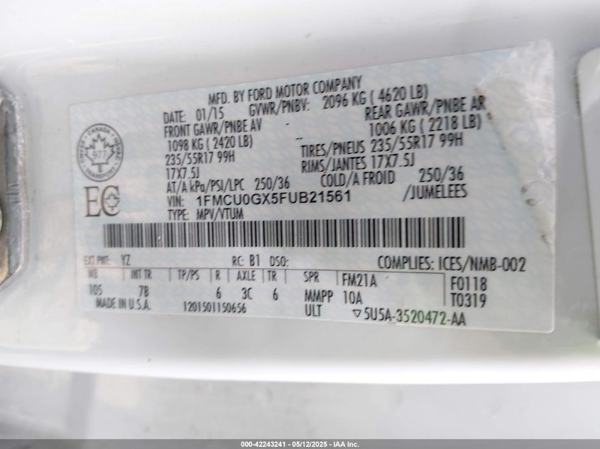 2015 FORD ESCAPE - 1FMCU0GX5FUB21561, колір - Білий, 1.6, Бензин, Передній привід із США