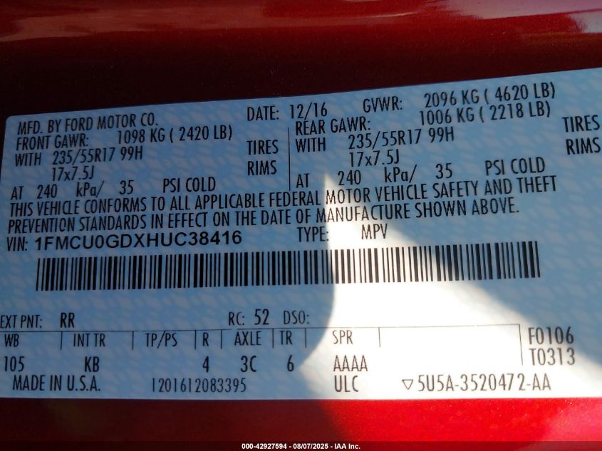 Колір ЧервонийЦиліндри 4Привід Передній привідVIN 1FMCU0GDXHUC38416Стан Заводиться та їде (перевірено)Ушкодження Звичайний знос