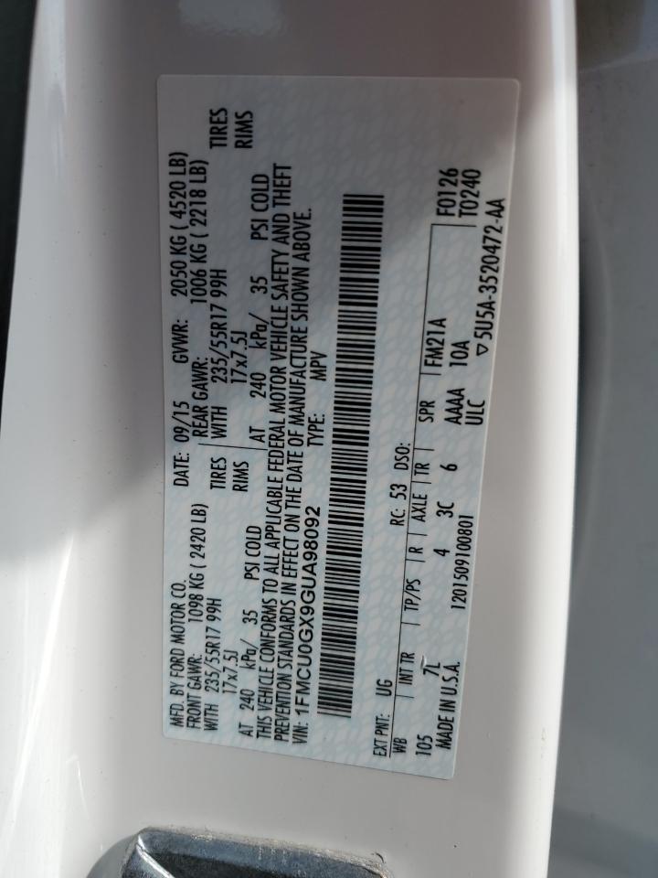 2016 FORD ESCAPE - 1FMCU0GX9GUA98092, колір - Білий, 1.6, Бензин, із США