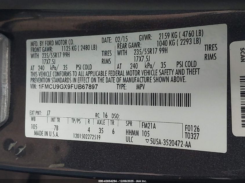 Колір СірийЦиліндри 4Привід Повний привідVIN 1FMCU9GX9FUB67897Стан Заводиться та їде (перевірено)Ушкодження Звичайний зносДата аукціона 2025-12-22