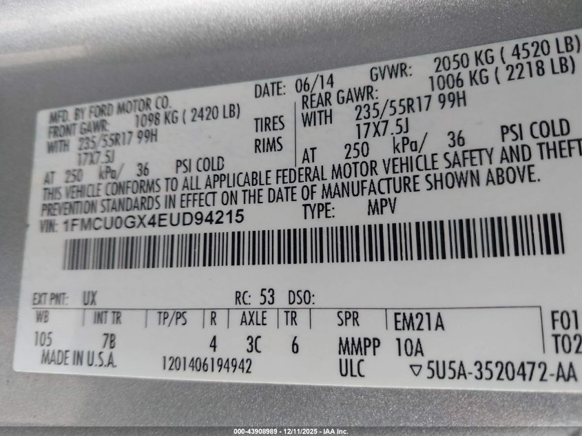 2014 FORD ESCAPE - 1FMCU0GX4EUD94215, колір - Срібний, 1.6, Бензин, Передній привід із США