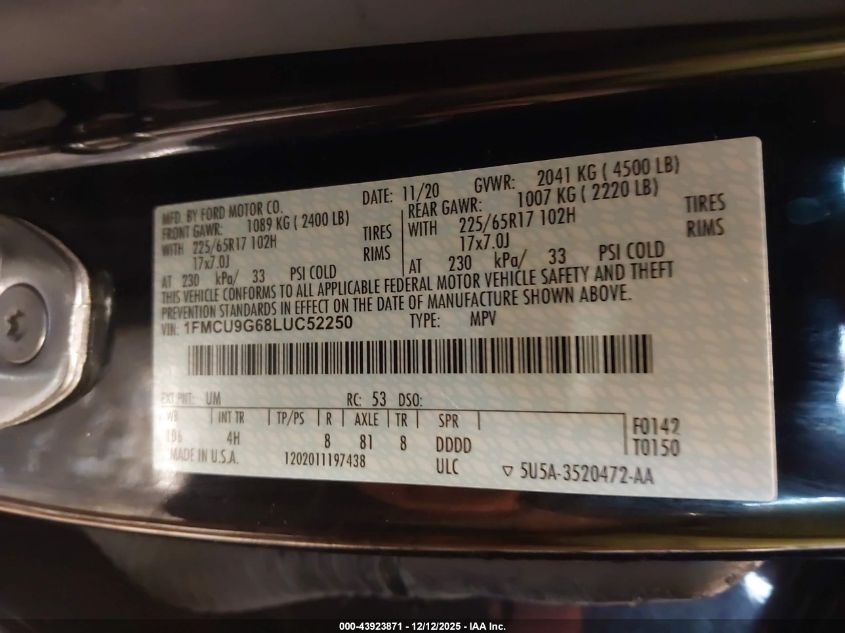 2020 FORD ESCAPE - 1FMCU9G68LUC52250, колір - Чорний, 1.5, Бензин, Повний привід із США