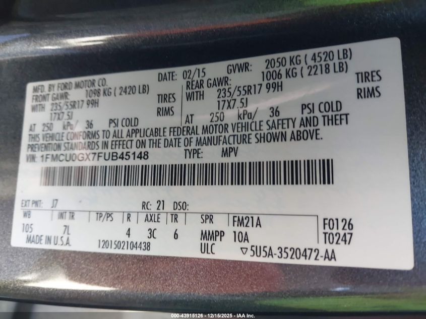 Колір СірийЦиліндри 4Привід Передній привідVIN 1FMCU0GX7FUB45148Стан Заводиться та їде (перевірено)Ушкодження Передня або задня