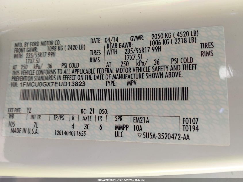 2014 FORD ESCAPE - 1FMCU0GX7EUD13823, колір - Білий, 1.6, Бензин, Передній привід із США