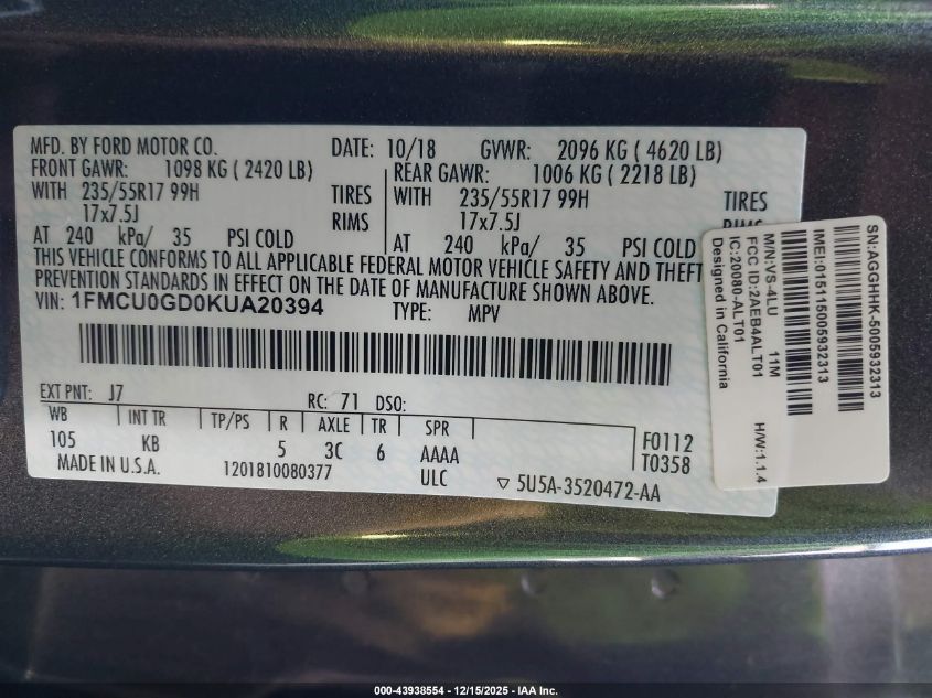 Колір СірийЦиліндри 4Привід Передній привідVIN 1FMCU0GD0KUA20394Стан ЗаводитьсяУшкодження Задня права