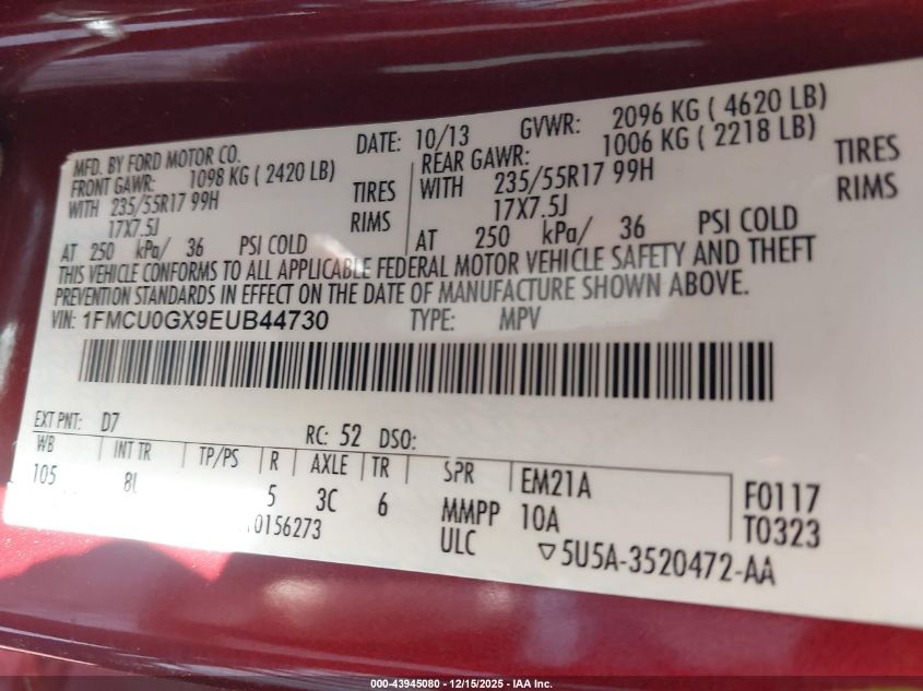 Колір Циліндри 4Привід Передній привідVIN 1FMCU0GX9EUB44730Стан НевідомоУшкодження Звичайний знос