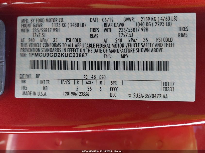 Колір АпельсиновийЦиліндри 4Привід Повний привідVIN 1FMCU9GD2KUC23887Стан НевідомоУшкодження Задня ліва