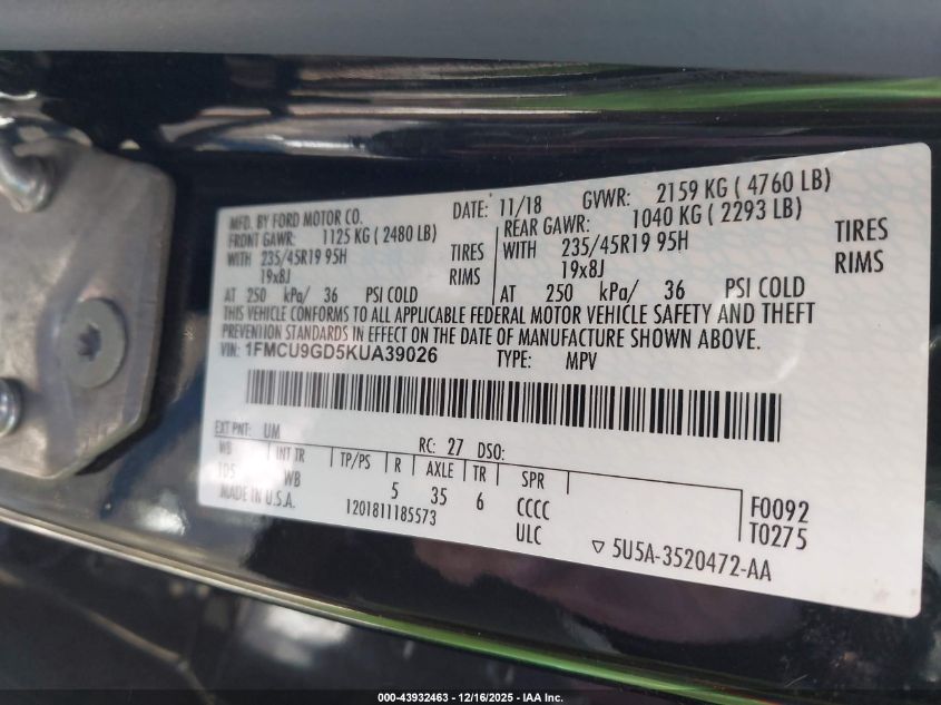 Колір Циліндри 4Привід Повний привідVIN 1FMCU9GD5KUA39026Стан НевідомоУшкодження Передня або задня