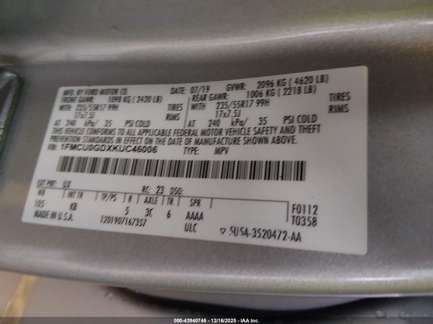 Колір Циліндри 4Привід Передній привідVIN 1FMCU0GDXKUC46006Стан НевідомоУшкодження Невідомо
