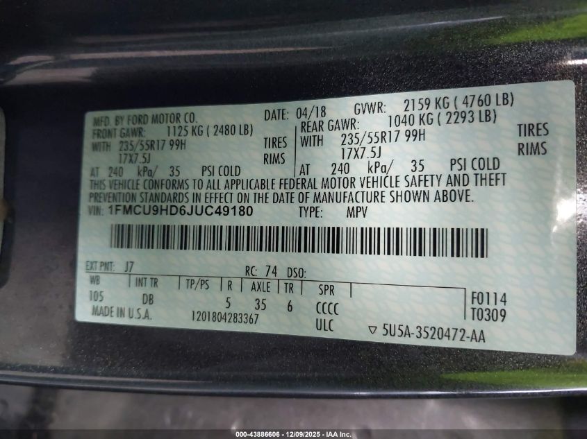 Колір СірийЦиліндри 4Привід Повний привідVIN 1FMCU9HD6JUC49180Стан ЗаводитьсяУшкодження Передня або задня