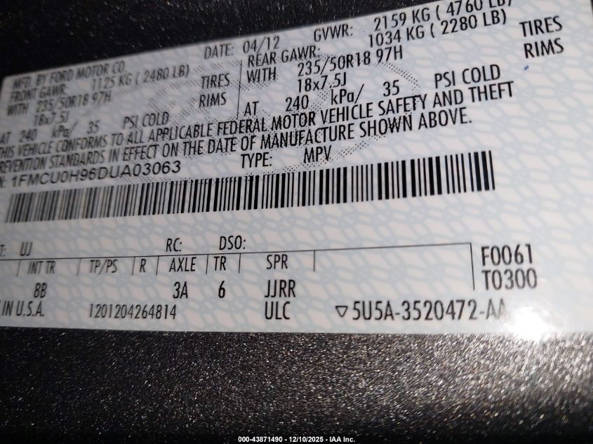 Колір СірийЦиліндри 4Привід Передній привідVIN 1FMCU0H96DUA03063Стан СтаціонарноУшкодження Звичайний знос