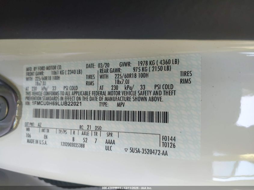 2020 FORD ESCAPE - 1FMCU0H69LUB22021, колір - Білий, 1.5, Бензин, Передній привід із США