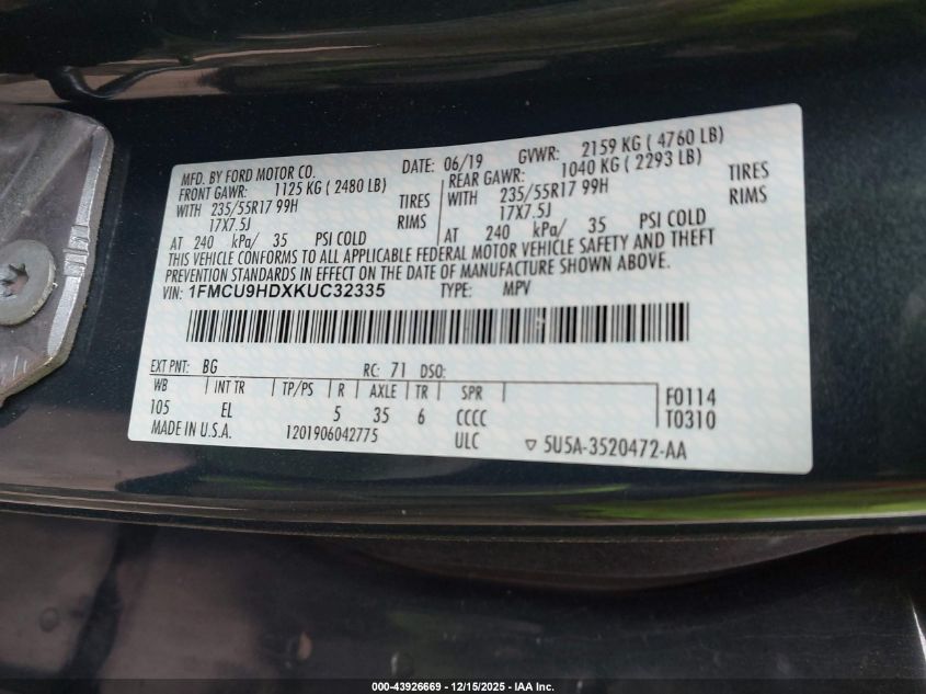 Колір СинійЦиліндри 4Привід Повний привідVIN 1FMCU9HDXKUC32335Стан ЗаводитьсяУшкодження Передня ліва