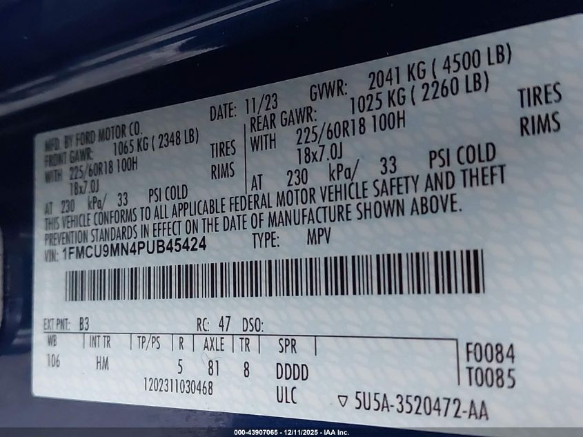 Колір СинійЦиліндри 3Привід Повний привідVIN 1FMCU9MN4PUB45424Стан СтаціонарноУшкодження Передня або задня